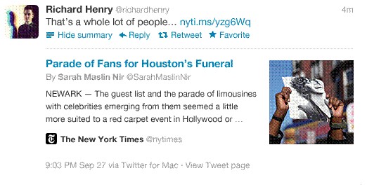 Twitter Cards實(shí)際上是一種為拓展后的、富媒體的Twitter消息提供支持的技術(shù)。在加入一些代碼行以后,出版商、品牌和開(kāi)發(fā)者就能創(chuàng )造出更好的Twitter消息,在Twitter數據流內部展示其內容。舉例來(lái)說(shuō),當AllThingsD和《紐約時(shí)報》等網(wǎng)站通過(guò)Twitter消息來(lái)發(fā)布指向一篇報道的鏈接時(shí),一張“摘要卡”就能顯示出一個(gè)更加精心設計的版本,就像是這樣: