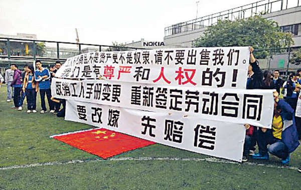 11月19日,一名諾基亞?wèn)|莞工廠(chǎng)的員工在微博爆料稱(chēng),諾基亞?wèn)|莞制造工廠(chǎng)的員工認為諾基亞出售手機業(yè)務(wù)的過(guò)程中未能獲得合理經(jīng)濟補償,約有百名員工參與了抗議停工活動(dòng)。根據爆料微博,當天諾基亞?wèn)|莞工廠(chǎng)的員工在園區內的空地上打出了維權橫幅,并在草地上靜坐表示抗議。