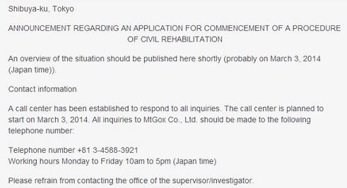 據國外媒體報道,剛剛宣布破產(chǎn)的Mt.Gox日前在其官網(wǎng)上發(fā)布了一則日語(yǔ)和英語(yǔ)的公告,并提供了一個(gè)電話(huà)號碼,接受來(lái)自所有用戶(hù)任何有關(guān)于Mt.Gox問(wèn)題的詢(xún)問(wèn)。