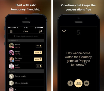 這款應用的開(kāi)發(fā)團隊來(lái)自美國,它們熟悉當下年輕人的交友方式,“Sobrr”能讓這些人無(wú)所顧忌的暢所欲言,就算拍下了一些讓他們后悔的照片,或說(shuō)過(guò)了一些不合時(shí)宜的話(huà)也無(wú)所謂,適合大膽表達自己的情緒。如果對方是陌生人,你們之間的交流時(shí)間僅有24小時(shí),只有在雙方互有好感的情況下才能得到聯(lián)系方式,否則你們只是對方生命中的過(guò)客。