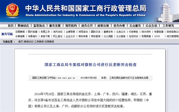 2014年7月28日,根據《反壟斷法》規定,國家工商總局專(zhuān)案組對微軟公司在中國大陸的四個(gè)經(jīng)營(yíng)場(chǎng)所,即微軟(中國)有限公司以及上海、廣州、成都的分公司同時(shí)進(jìn)行突擊檢查。被檢查人員包括微軟公司副總裁、公司高級管理人員以及市場(chǎng)、財務(wù)等部門(mén)相關(guān)人員。工商執法人員復制了微軟公司部分合同和財務(wù)報表,提取了電腦、服務(wù)器中儲存的內部溝通文件、郵件等大量電子數據,查封扣押了2部工作電腦。目前微軟公司以部分主要待檢查人員不在國內、北京或聯(lián)系不上為由,使本次突擊檢查未完成全部檢查內容。