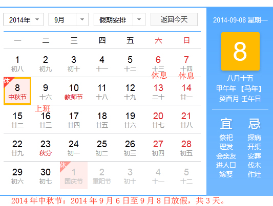 2014年中秋節在即,為了便于提前安排好工作和生活,現根據國務(wù)院辦公廳通知精神及公司的福利政策,將中秋節期間的放假安排通知如下: