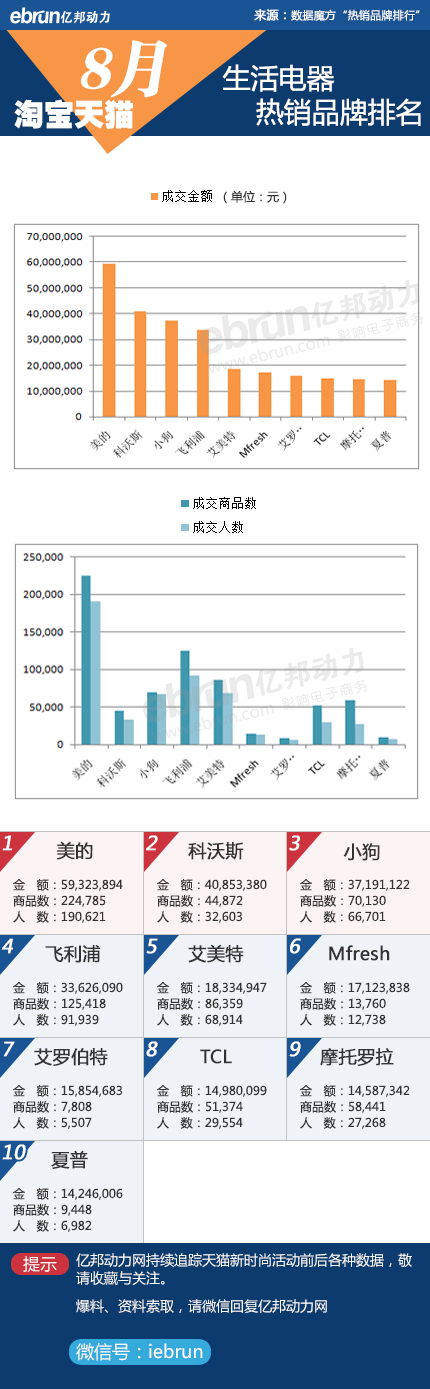 9月9日消息,億邦動(dòng)力網(wǎng)根據數據魔方信息,匯總了8月份生活電器品類(lèi)在淘寶和天貓平臺銷(xiāo)售排名前十品牌的銷(xiāo)售數據。美的在8月的銷(xiāo)售出現了大幅下滑,不過(guò)依舊以5932萬(wàn)元的成交額排在榜首。