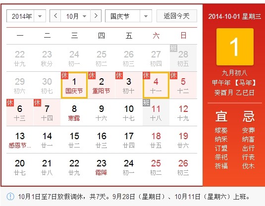 10月1日(星期三)至10月7日(星期二)放假調休,共7天。9月28日(星期日)、10月11日(星期六)上班。