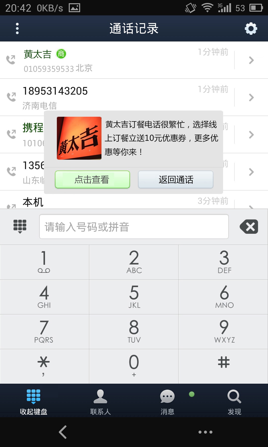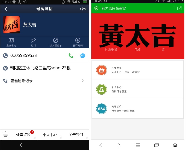 以最近人氣火爆的黃太吉煎餅為例,顧客在給黃太吉打了一個(gè)送餐電話(huà)后,即自動(dòng)關(guān)注了黃太吉來(lái)店。隨后,黃太吉主動(dòng)推送最新商品服務(wù)信息,顧客在360通訊錄中看到未讀信息,點(diǎn)擊進(jìn)入后即可查看到黃太吉其他店鋪的相關(guān)信息,并可在線(xiàn)訂餐及商家導航。值得關(guān)注的是,當中午訂餐熱線(xiàn)繁忙時(shí),來(lái)店會(huì )提醒用戶(hù)轉為在線(xiàn)訂餐,并實(shí)時(shí)推送在線(xiàn)訂餐的優(yōu)惠信息,從而避免了因電話(huà)不通而造成的客戶(hù)流失。