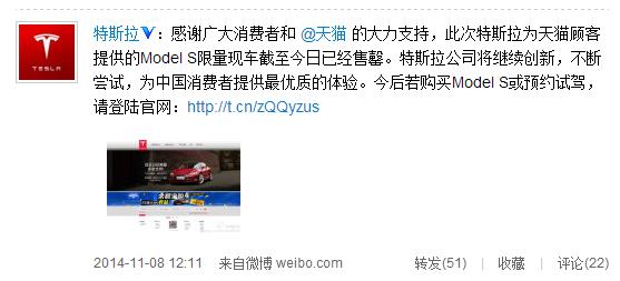 11月8日,特斯拉公司午間發(fā)布微博稱(chēng),特斯拉為天貓顧客提供的Model S限量現車(chē)截至已經(jīng)售罄,今后消費者若需購買(mǎi)Model S或預約試駕,需登錄特斯拉官方網(wǎng)站。目前,天貓特斯拉旗艦店已關(guān)閉,所有車(chē)型信息均已下線(xiàn),此前已交付定金的用戶(hù),特斯拉會(huì )繼續為其服務(wù)直至整個(gè)服務(wù)完成。