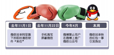 繼今年4月之后,25日晚,阿里入股的新浪微博再次對微信進(jìn)行封殺,禁止用戶(hù)利用微博推廣微信公眾賬號,到期沒(méi)有清除微信公眾號推廣的賬戶(hù)將可能面臨封號。這令外界聯(lián)想到日前曝出的微信封殺阿里旗下快的打車(chē)紅包一事。
