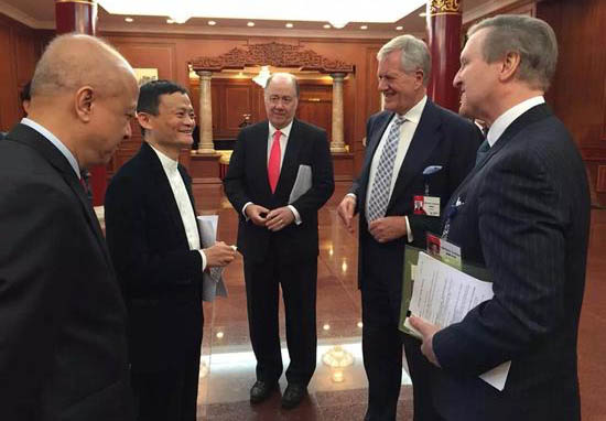 (圖為馬云與中國發(fā)展研究基金會(huì )秘書(shū)長(cháng)盧邁等,來(lái)自新浪網(wǎng))