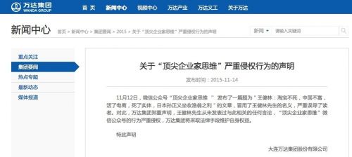 此外,萬(wàn)達集團已向國家網(wǎng)信辦舉報“頂尖企業(yè)家思維”公眾號的侵權行為。