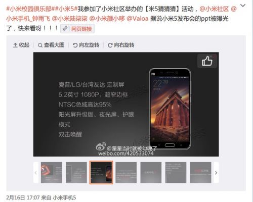 昨天,有微博用戶(hù)曝光了一組據說(shuō)是“小米5發(fā)布會(huì )PPT”的相關(guān)圖片,而該系列圖片中,關(guān)于小米5的各類(lèi)信息配置一應俱全,大有提前揭露底牌之勢。