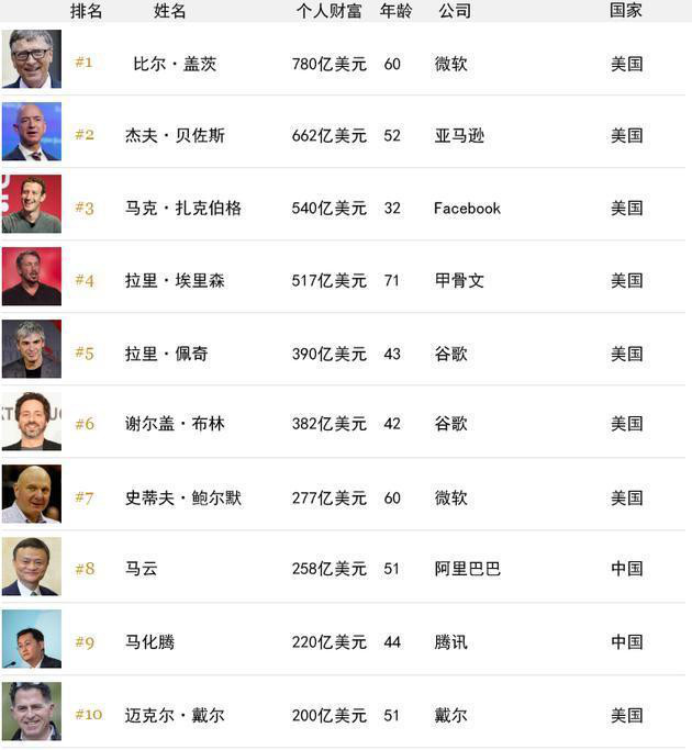 《福布斯》周三發(fā)布的第二份科技行業(yè)百富榜顯示,微軟聯(lián)合創(chuàng )始人比爾·蓋茨以780億美元的個(gè)人財富再度登頂,其次是亞馬遜CEO杰夫·貝佐斯(Jeff Bezos)的660億美元和Facebook CEO馬克·扎克伯格(Mark Zuckerberg)的540億美元。甲骨文聯(lián)合創(chuàng )始人拉里·埃里森(Larry Ellison)下滑兩位至第4位,個(gè)人財富為517億美元。