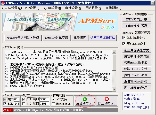 APMServ 5.2.6 是一款擁有圖形界面的快速搭建Apache 2.2.9、PHP 5.2.6、MySQL 5.1.28&4.0.26、Nginx 0.7.19、Memcached 1.2.4、phpMyAdmin 2.11.9.2、OpenSSL、SQLite、ZendOptimizer,以及ASP、CGI、Perl網(wǎng)站服務(wù)器平臺的綠色軟件。無(wú)需安裝,具有靈活的移動(dòng)性,將其拷貝到其它目錄、分區或別的電腦時(shí),均只需點(diǎn)擊APMServ.exe中的啟動(dòng)按鈕,即可自動(dòng)進(jìn)行相關(guān)設置,將Apache和MySQL安裝為系統服務(wù)并啟動(dòng)。APMServ集合了Apache穩定安全的優(yōu)點(diǎn),并擁有跟IIS一樣便捷的圖形管理界面,同時(shí)支持MySQL 5.0 & 4.0兩個(gè)版本,虛擬主機、虛擬目錄、端口更改、SMTP、上傳大小限制、自動(dòng)全局變量、SSL證書(shū)制作、緩存性能優(yōu)化等設置,只需鼠標一點(diǎn)即可完成。