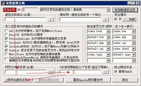 保存好虛擬主機后,要點(diǎn)擊“重啟Apache使設置生效”,新的站點(diǎn)才會(huì )生效。