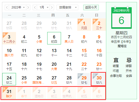 調休安排:2022年1月29(星期六)上班。
